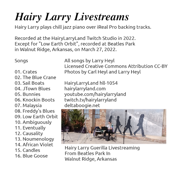 And that's Hairy Larry singing "Noumenology". Don't miss Something Blue, Saturday night at 10:00, for more piano improvisatation from my "Hairy Larry Livestreams" album. Plus Sun Ra, David Dellacroce, Lee Ritenour, and Dave Grusin.