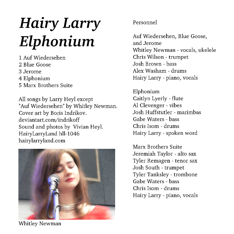 On "Elphonium" you will hear Caitlyn Lyerly - flute, Al Clevenger - vibes, Josh Huffstutler - marimbas, Gabe Waters - bass, Chris Isom - drums, and Hairy Larry reading spoken word. These students are all from Northeast Arkansas or Southeast Missouri and they were all in the ASU jazz program. So here's a big shout out to these students and all the other students who helped with my recitals over the years. And years and years. Yes, I was in the music department for almost 20 years.