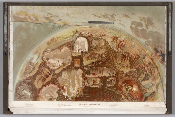 "Levi Walter Yaggy’s Geographical Study (1887) unpacks like a matryoshka doll. The experience begins with a heavy wood box, outfitted with leather straps and brass clasps, inside of which is a sheaf of complex maps and charts, and a learning guide on how they should be used in the classroom. The maps are each the size of a small rug (ranging between two and four feet) — large enough to lay on the floor and have pupils gather around — and all save one are printed expensively, on thick paper with chromolithography. The exception is a green relief map of the United States, made of plaster and papier-mâché and built directly in the carrying case. It’s the least charming of the suite, though it made Yaggy justifiably proud: most of the mountains he depicts had yet to be measured. The remaining maps, of Earth and its cosmos, are packed in such a way as to avoid being crinkled by the Rocky Mountains."